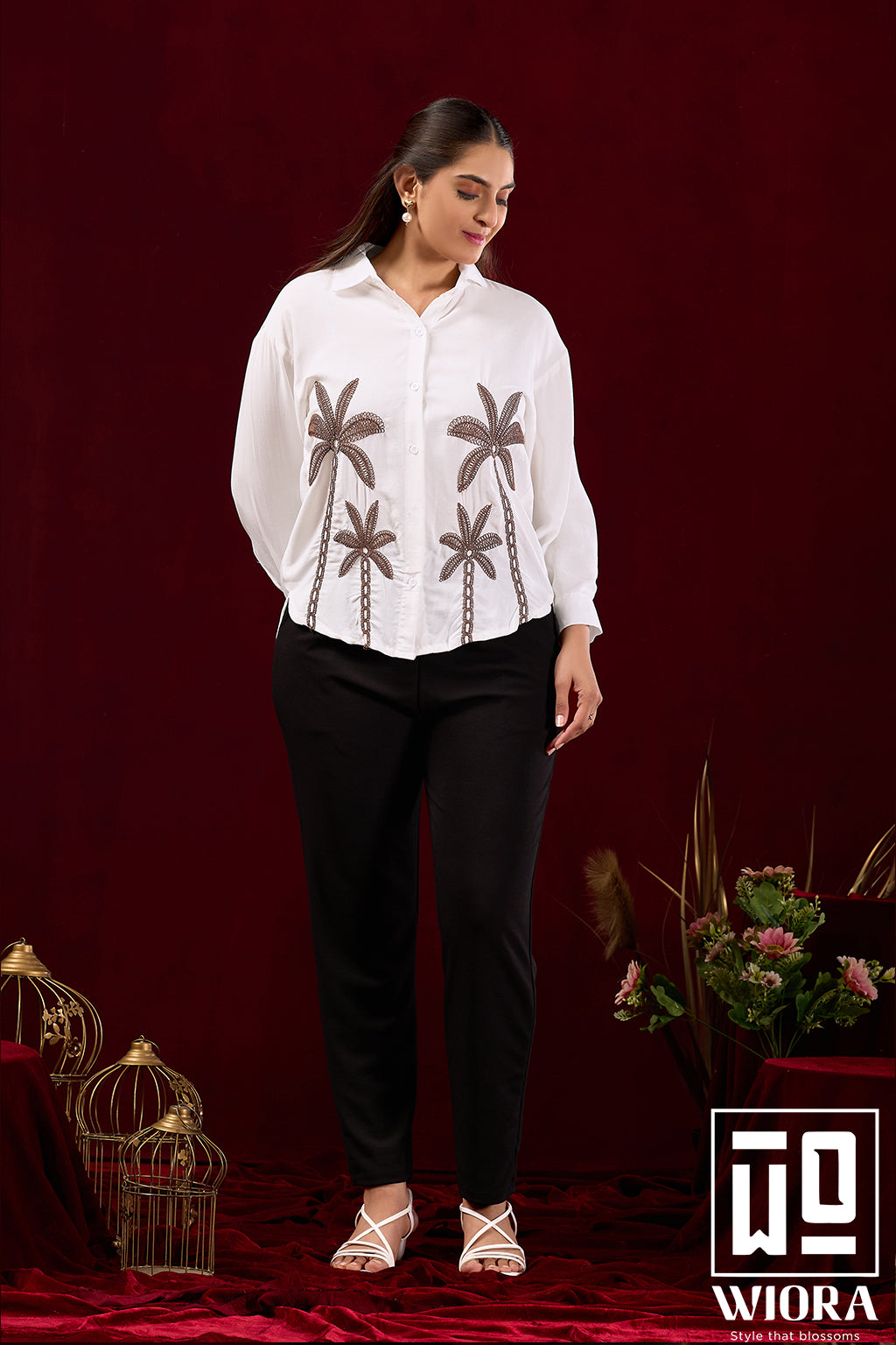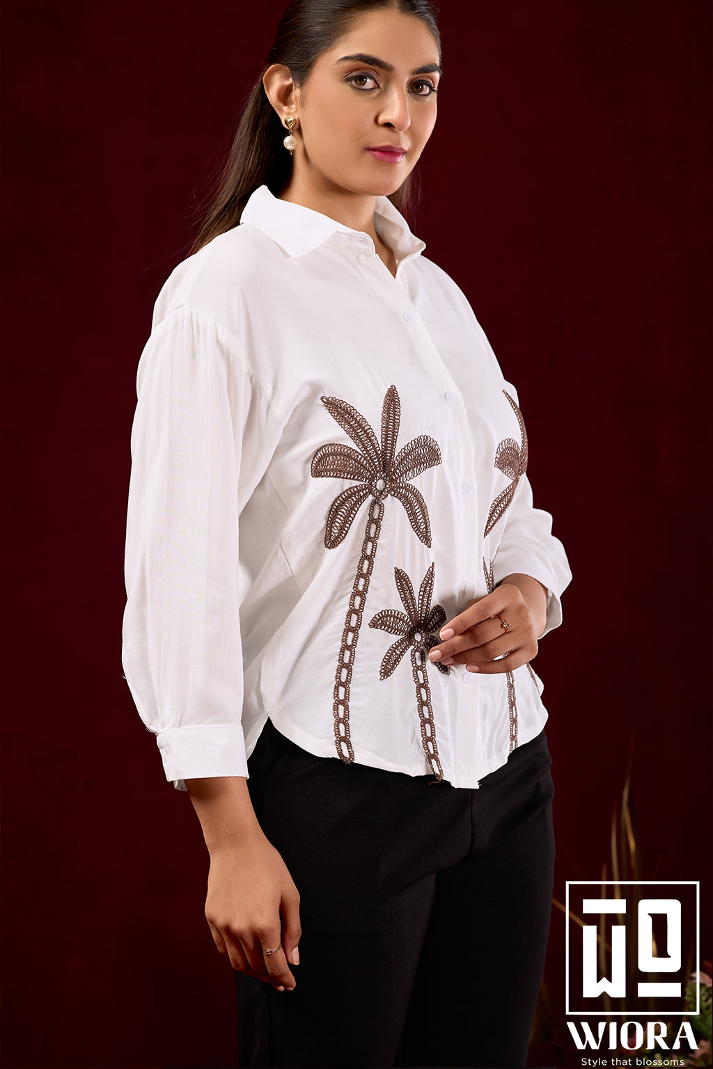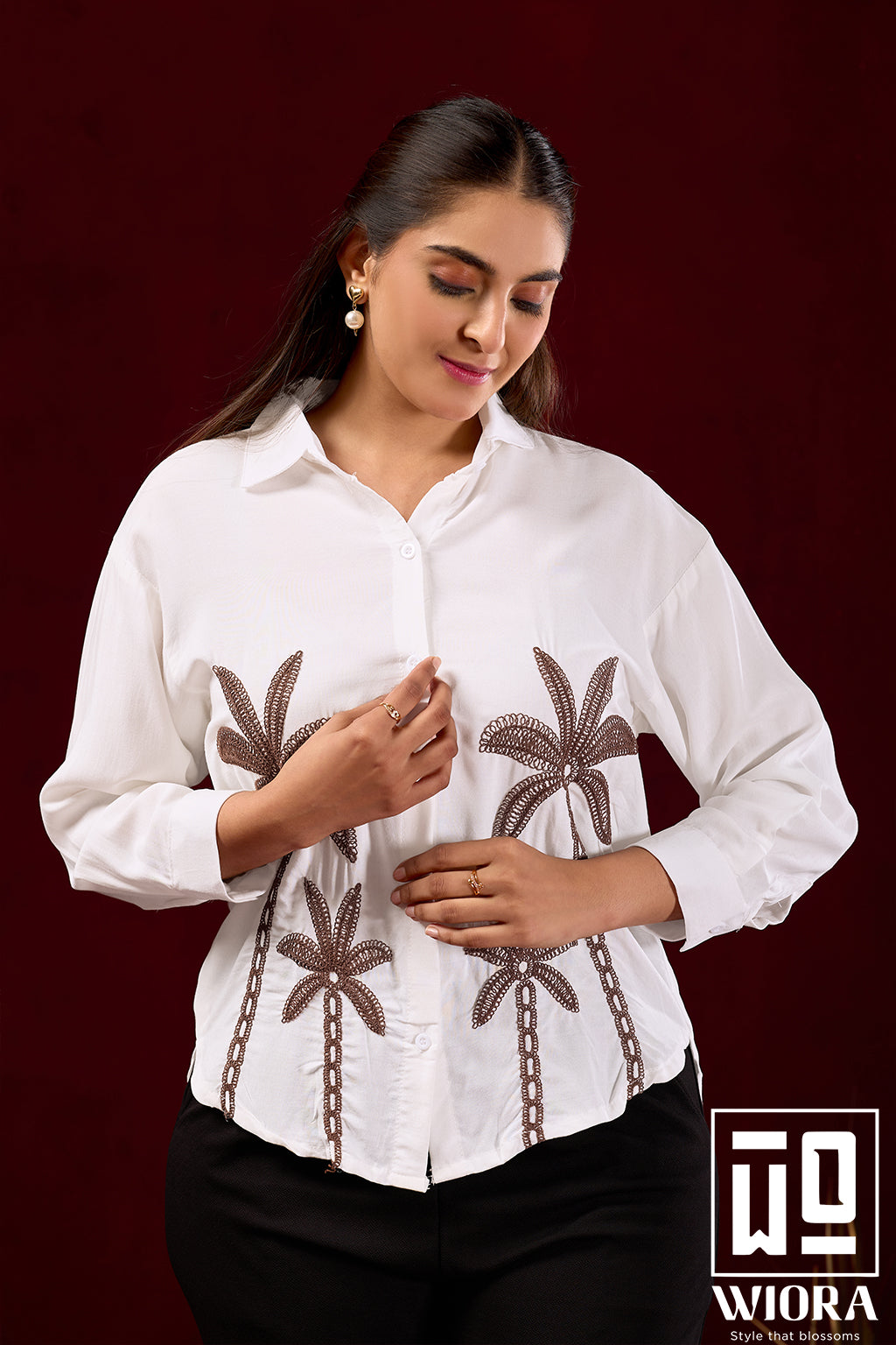Step into effortless elegance with this ivory white embroidered shirt, designed to elevate your everyday style. Featuring a classic collared neckline and front button closure, this shirt is adorned with intricate brown palm tree embroidery that adds a sophisticated tropical charm. Crafted from soft, breathable fabric, it ensures comfort throughout the day while maintaining a polished look. Perfect for office wear, casual outings, or smart-casual occasions, this versatile shirt pairs beautifully with black trousers, denim, or skirts.