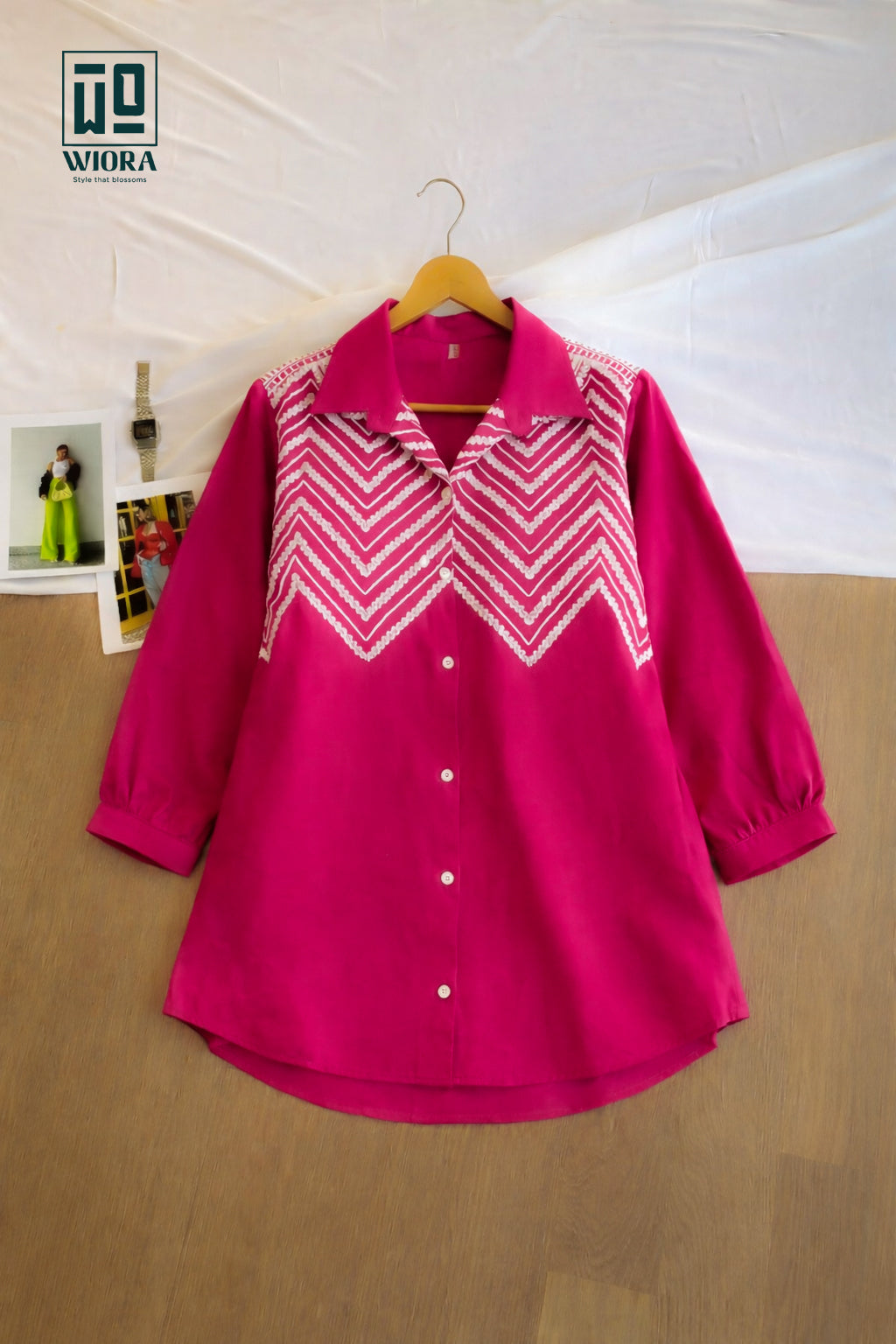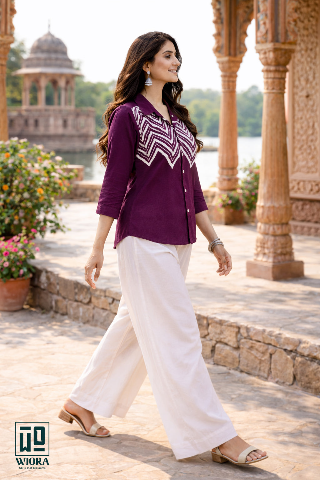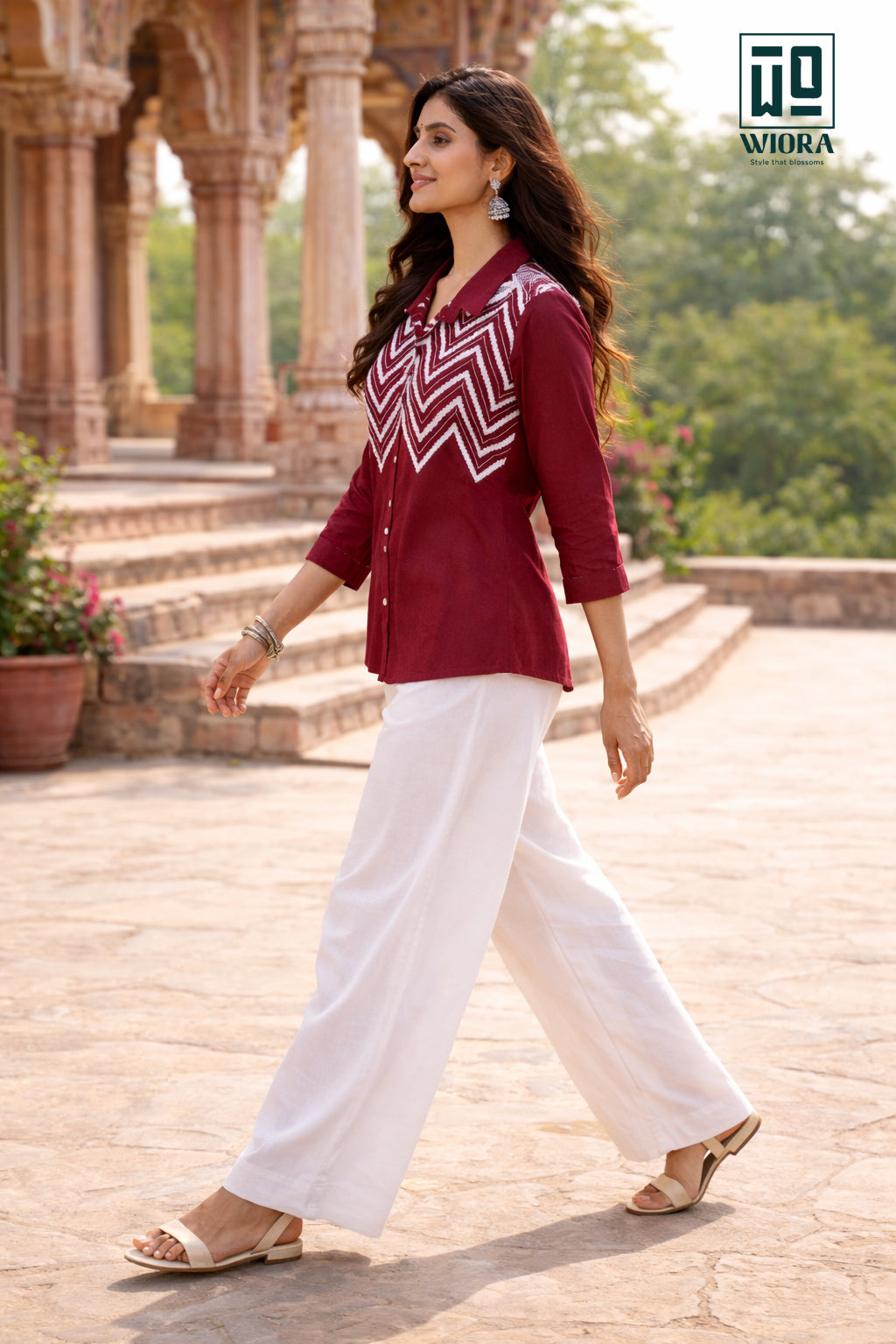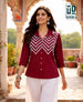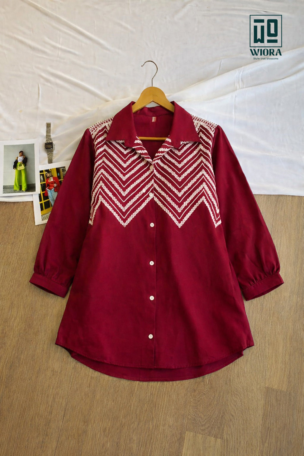 Add refined elegance to your wardrobe with this stunning Wiora Wine Embroidered Shirt. Designed with a classic shirt collar and front button closure, this sophisticated piece features intricate white thread chevron embroidery across the front, creating a bold yet graceful statement.