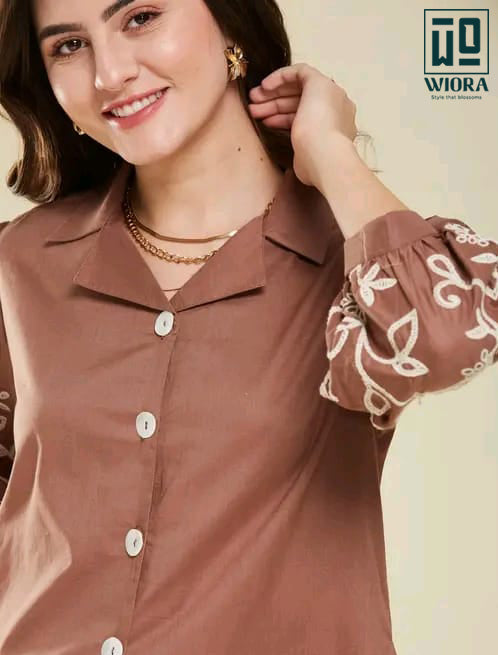 Add a touch of understated elegance to your wardrobe with this beautiful dusty rose embroidered shirt from Wiora. Designed with a classic shirt collar and front button closure, this stylish piece features intricate white thread floral embroidery on the sleeves, creating a graceful and feminine appeal. The softly gathered sleeves and statement buttons enhance its refined yet contemporary look.