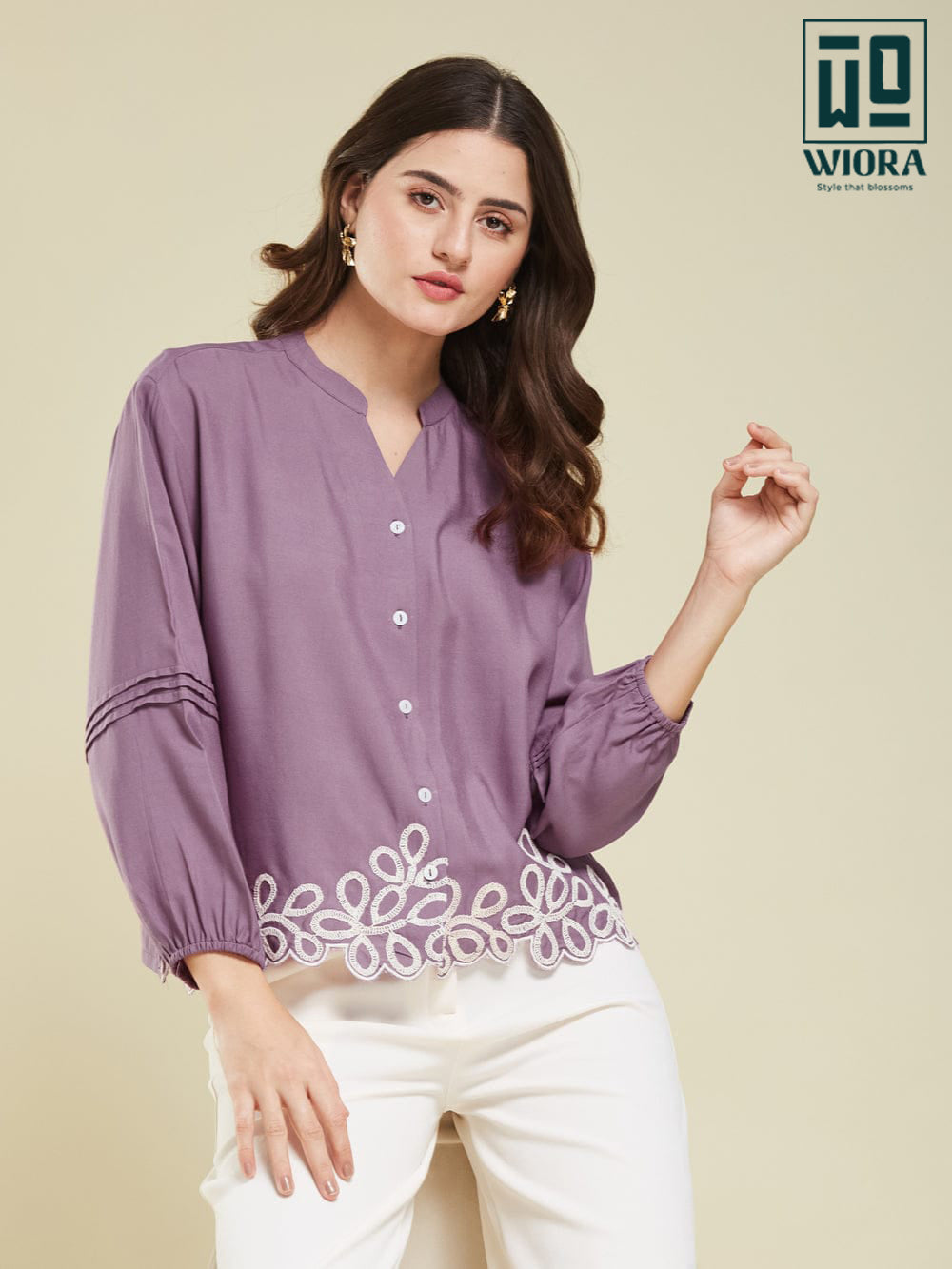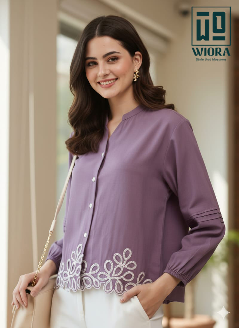 Add a graceful touch to your wardrobe with this elegant mauve shirt from Wiora. Designed with a refined mandarin collar and front button closure, this shirt features delicate white floral embroidery along the hem that brings a soft and feminine charm to the look. The subtle detailing on the sleeves enhances its sophisticated appeal.