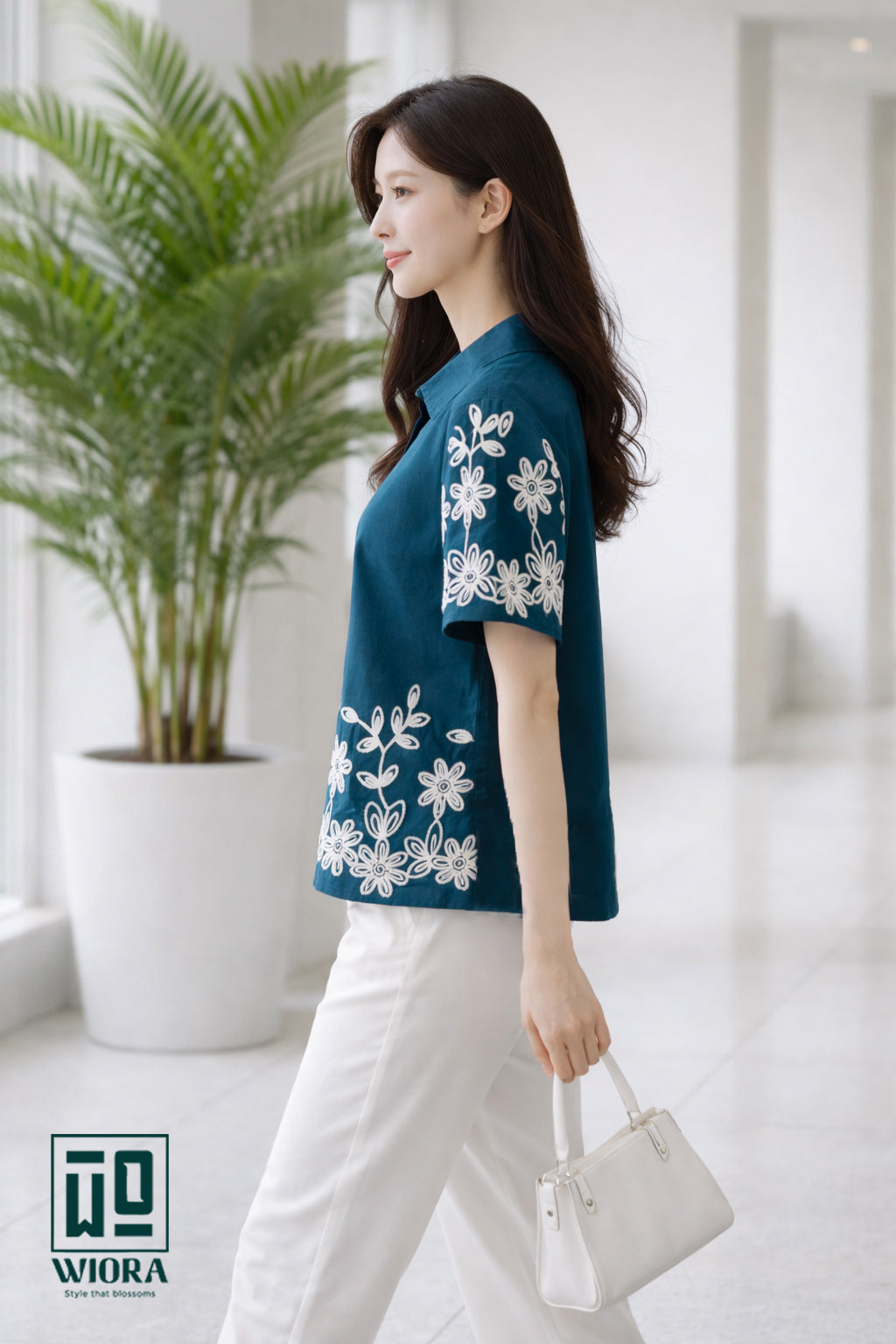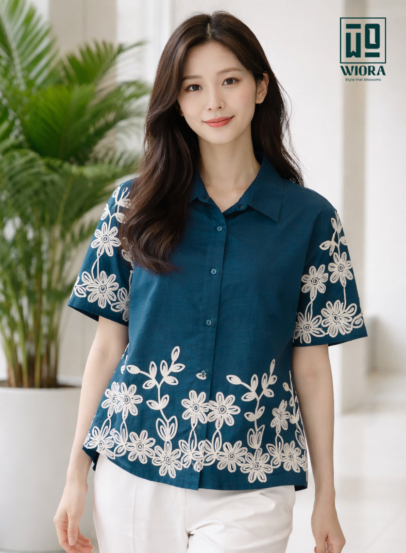 Elevate your everyday style with this elegant teal embroidered shirt from Wiora. Designed with a classic shirt collar and front button closure, this piece features intricate white floral embroidery along the sleeves and hemline, adding a graceful and feminine charm. Crafted from soft, breathable fabric, it ensures all-day comfort while maintaining a refined, polished look.